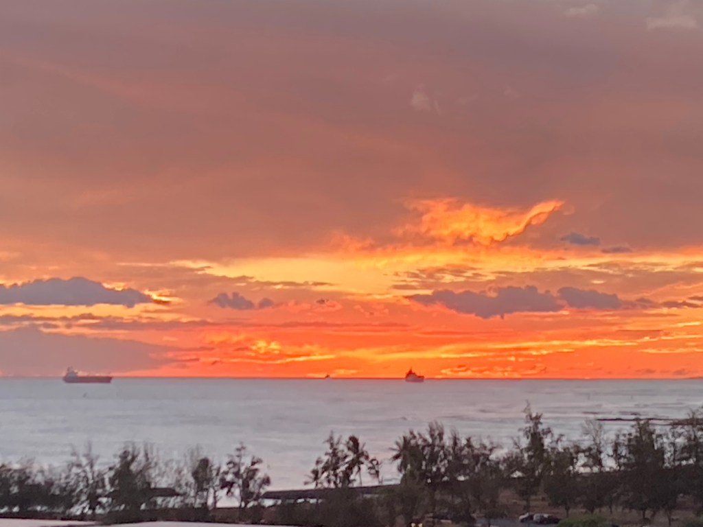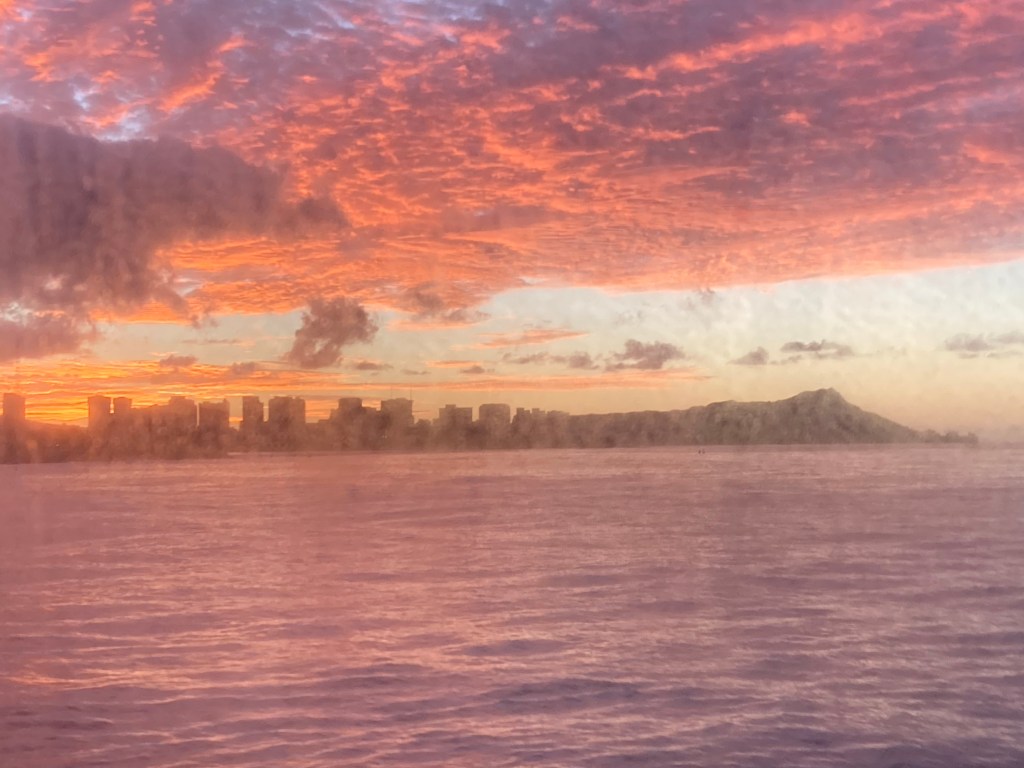 I woke up this morning just as we were transiting the channel into Honolulu Harbor. We were greeted by one of the most dramatically vivid sunrises I’ve ever seen. (And apparently everyone else too because it was all you heard about at breakfast.) My photo isn’t great because it was taken through my cabin window, but I think you can get some idea of how impactfully the day started.