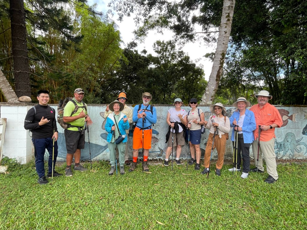 Soon we were at the end of the trail where we enjoyed some local bananas and guavas. The bananas were called “Ice Cream” bananas. Why that name, no one seemed to know. They were thick and wide – maybe 2 inches. Thick peel. Flesh slightly coral in color. Complex flavor: banana, of course, but with hint of peach or mango, and a lemon high note. I’d show you a photo if one had survived the onslaught of 10 cruise passengers who hadn’t been fed in four hours!!