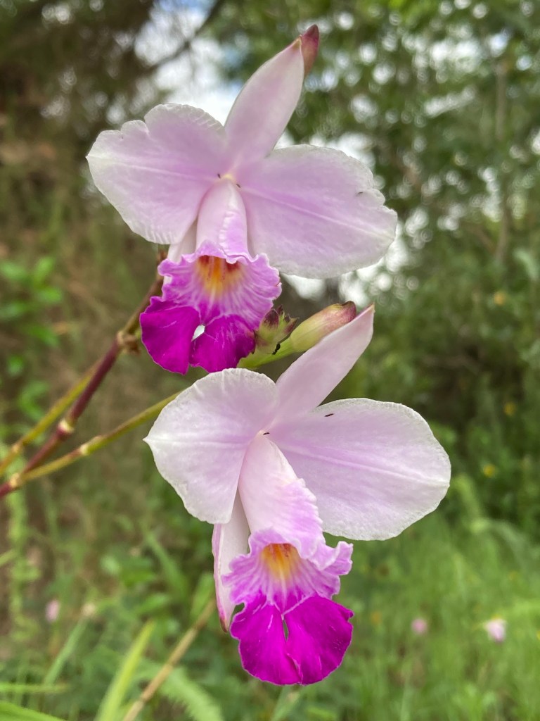 Purple ground orchids, pink Mellowstone bush, Sleeping Plant (retracting when touched) and wild Raspberries emblazoned the trail.