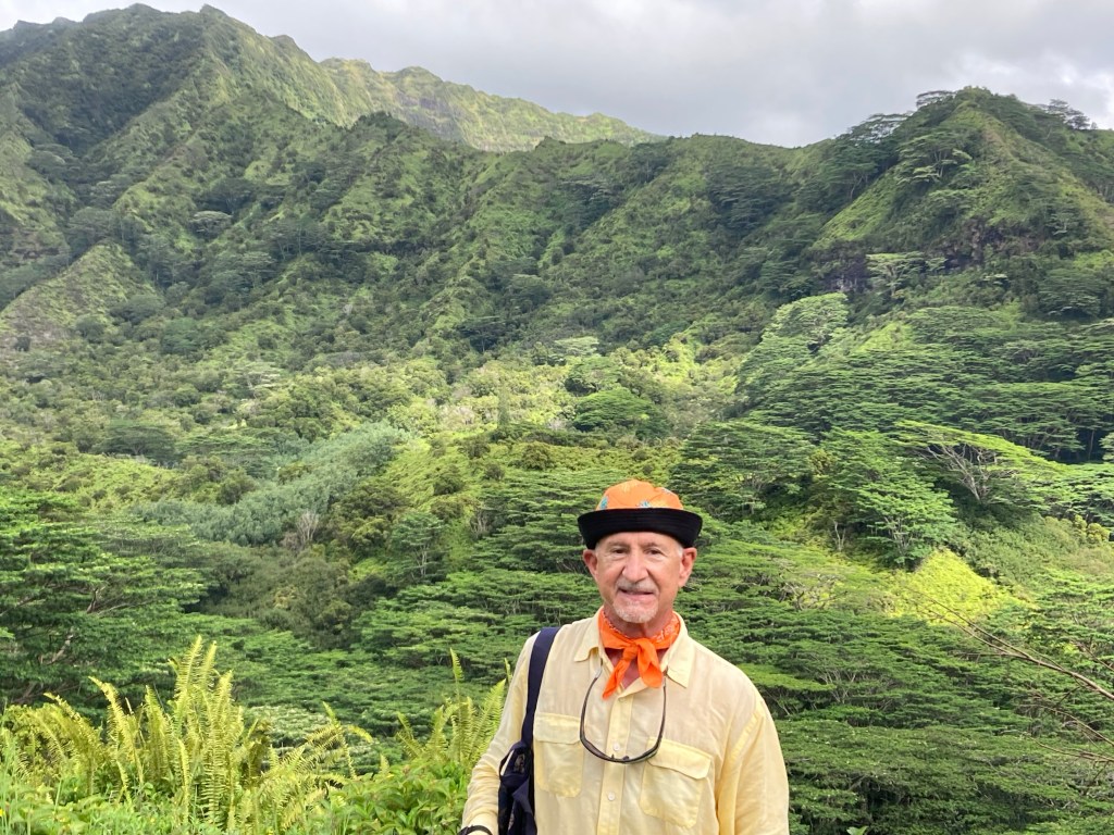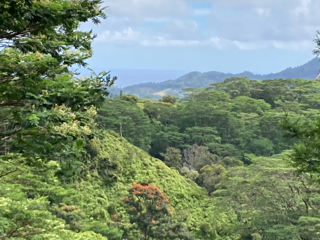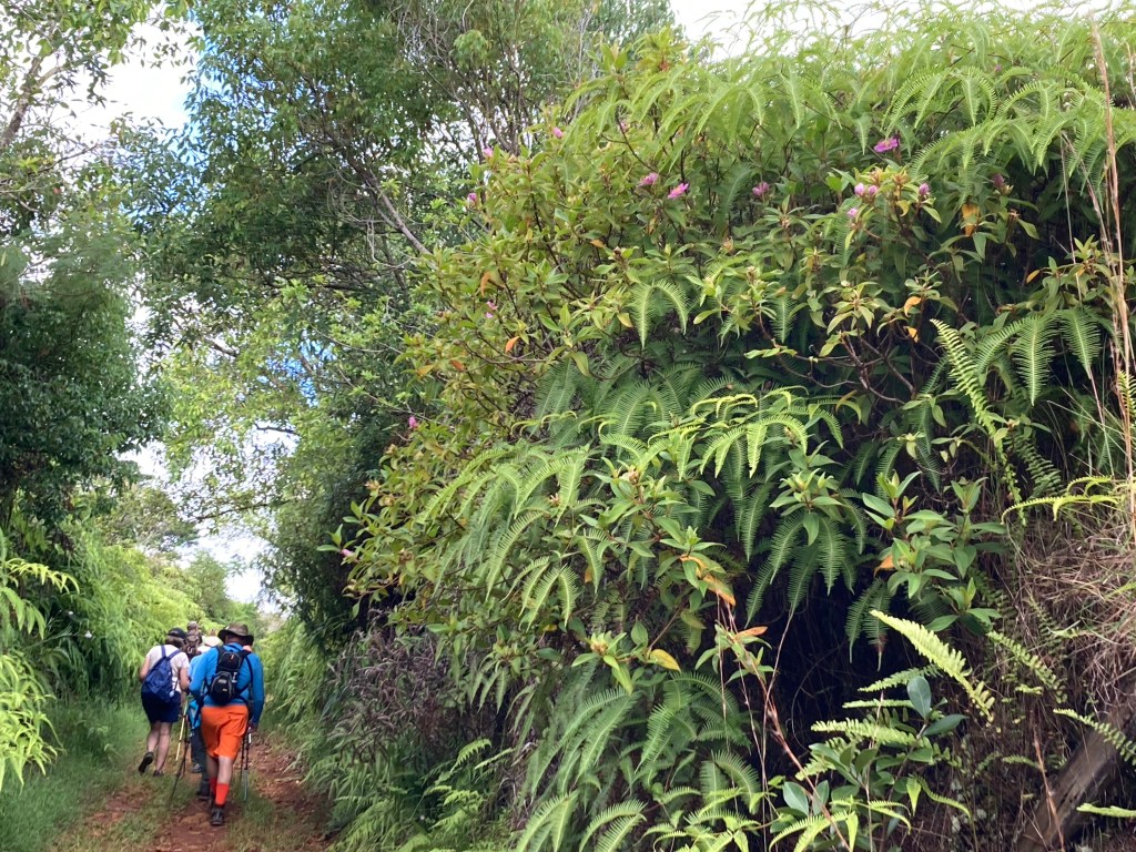 Many years ago I spent 2 weeks on Kauai, and I can attest to the truth of a popular T-shirt at the time which read: “Kauai, It’s Not For Wimps.” The island offers a cornucopia of scenic sites for hiking, swimming, snorkeling, diving and paddling, and I did my very best during that stay to see and do it all. But of course, one can’t. So, I was delighted to find a hike offered by the Holland America shore excursion desk that I had not done: traversing a ridge line high up in the Kapa’a range that offered an opportunity to view Mt. Wai’ale’ale’s crater remnant.