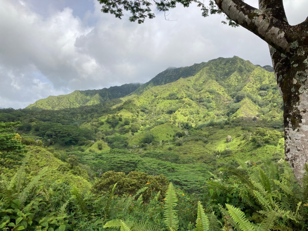 We soon arrived at our highest elevation: a plateau from which we would begin a series of switchbacks to descend the windward side of the ridge. Once we met up with the MoalepeTrail, conditions were significantly wetter, with a corresponding change in the flora. We hiked beneath fernlike canopies of colossal Albizia trees, the very ones that inspired the trees in Avatar, right down to their white, fluffy flowers.