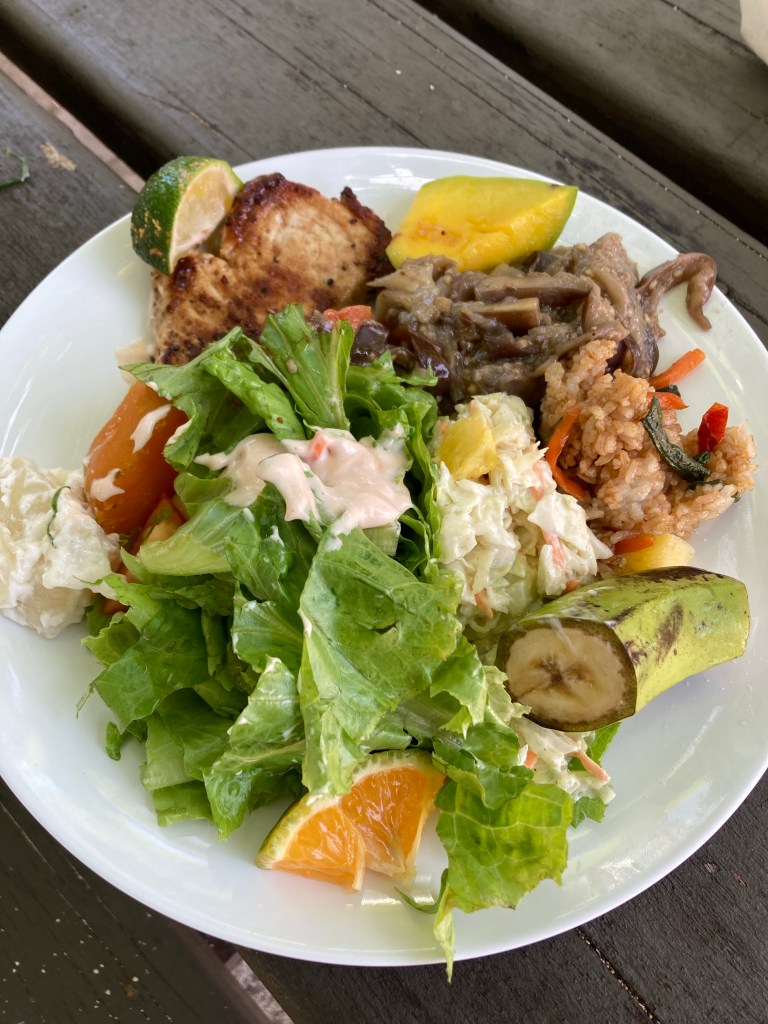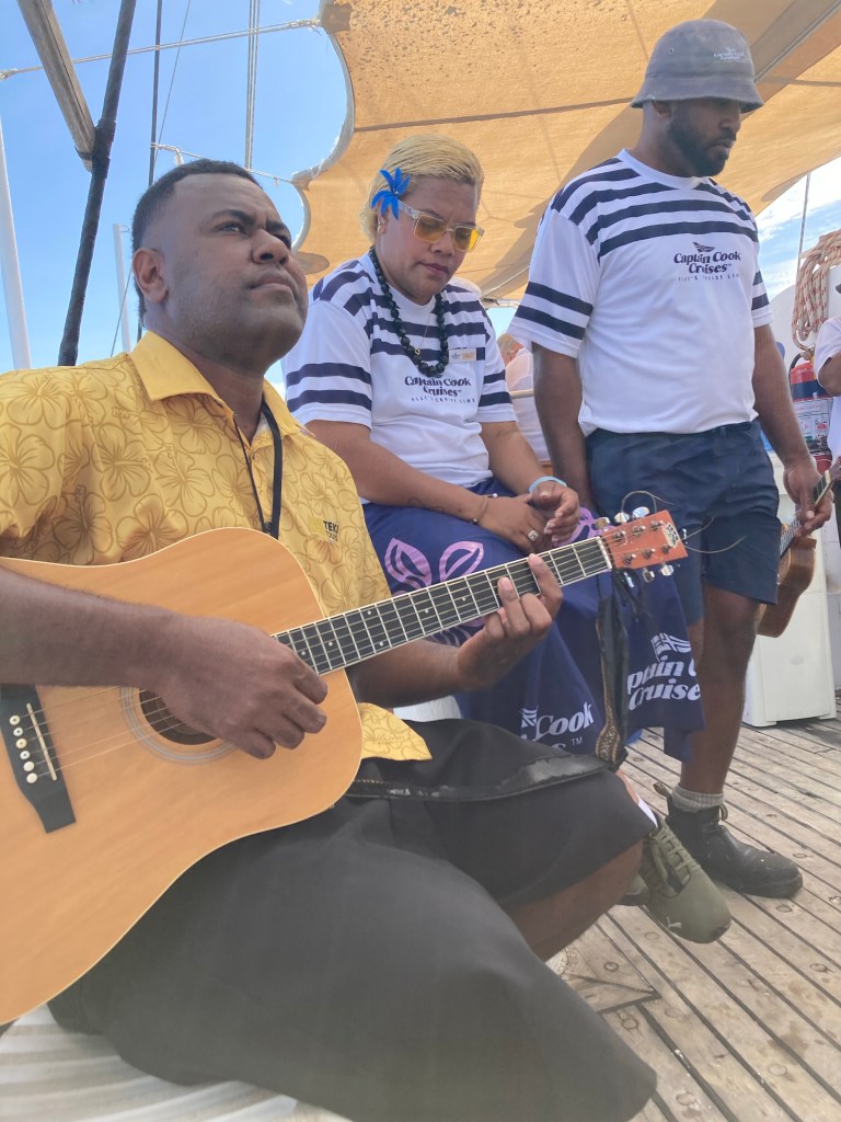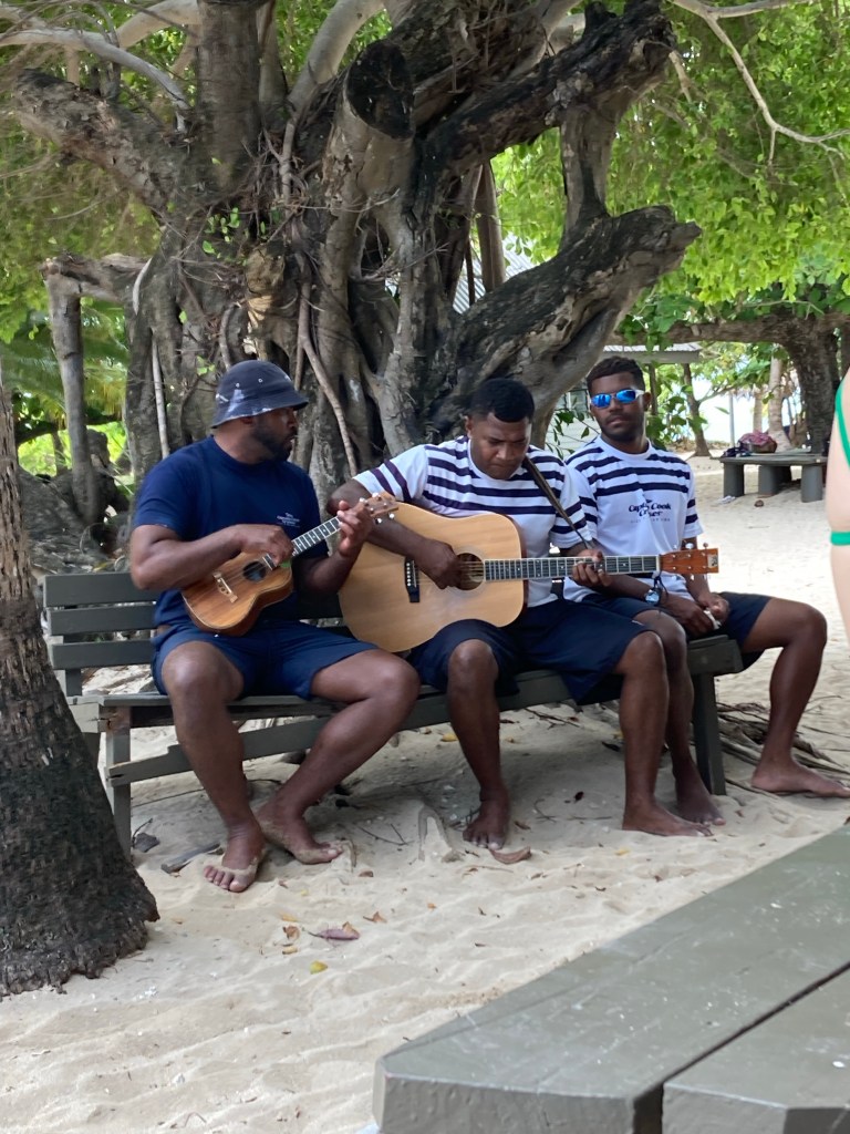 I know that my glass of Sauvignon Blanc was good and well-suited for the sumptuous buffet laid out for us at 1:00. Heaping bowls of tossed green salad, coleslaw with pineapple, potato salad, eggplant in garlic sauce – Fijian style, avocado, yams, sweet GREEN bananas (?), and many more sides that I didn’t have, along with a choice of grilled blue marlin, chicken or bratwurst. A trio of the crew entertained. Best of all, there were NO flies.