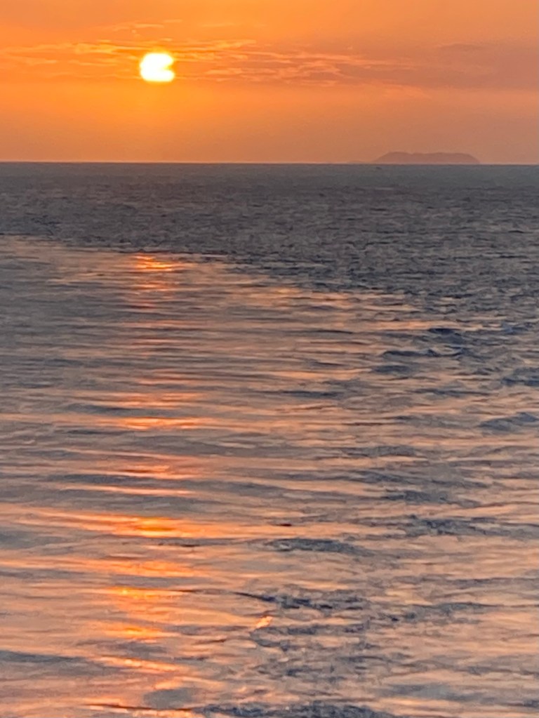 But, turned out we didn’t raise anchor until after sunset. A passenger got barbed by a stingray while out and about during the day. The ship’s doctor felt it prudent to have the passenger returned to shore so a local doctor with more experience could treat it. It was close to 7:00 before the patient and nurse returned to the Volendam.