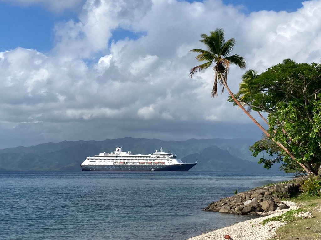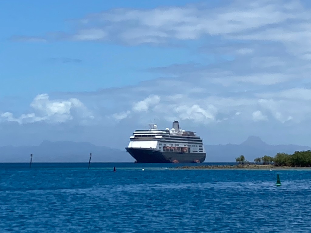Vanua Levu is the northern-most island of any consequence in Fiji, and it’s shaped a bit like a mother platypus with a baby platypus alongside, which is a long way of saying it’s oddly shaped. (Check it out on Google Maps). Where the mother platypus’ left leg joins her trunk, there is a large, protected bay, and within that bay an even more protected cove between Nawi Island and the small town of Savusavu, (pop. 3,500). This is where the Volendam dropped anchor at 8:00 am and our tender process began. I didn’t hurry off, as I was putting the final touches on two posts I wanted to upload to the blog.