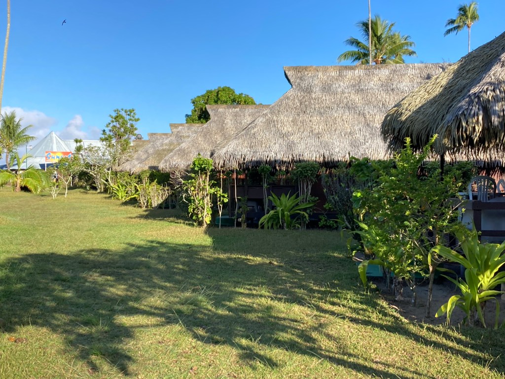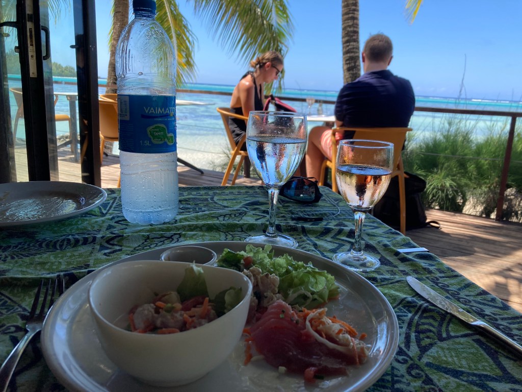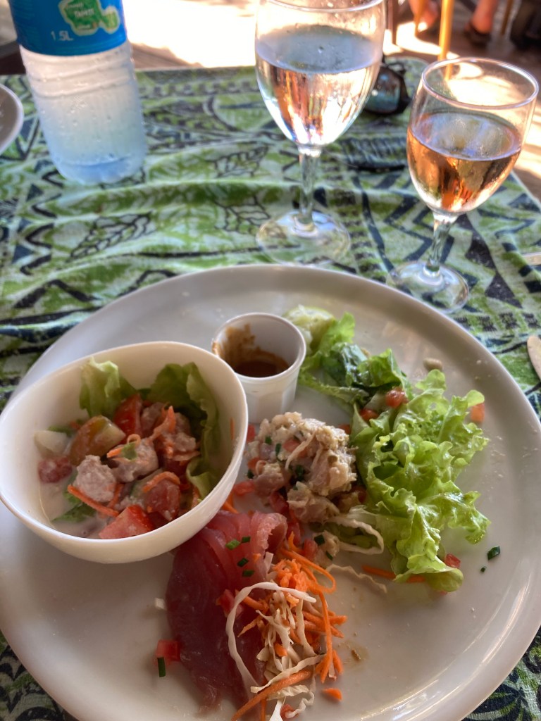 Lunch at the Tipanier Hotel is a simple affair. There is only one item on the menu: Poisson Cru. On this day, tuna — the freshest tuna I’ve ever had! It’s offered as tartare, carpaccio, or poke Tahitian style in lime and coconut. Also, thankfully, a Trio plateis available which I leapt at. When my lunch arrived, I began to understand why access to this spot must be controlled. There was easily a pound of silken, sushi-grade blackfin in total amongthe three presentations on my plate. None of it could have been out of the water for more than a few hours. So yes, better to control the number of customers in advance rather than sending any home hungry when the tuna runs out! All was forgiven – well, at least for this establishment.