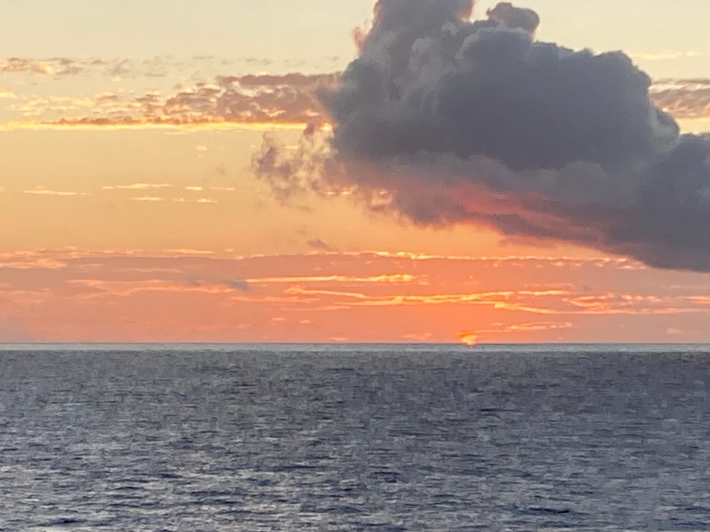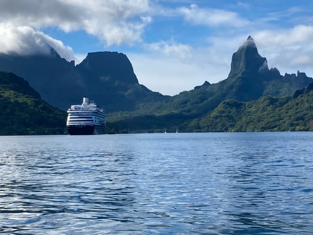 I made it back onboard the Volendam around 4:00. Plenty of time to freshen up and then go to the aft deck for raising of the anchor at 5:00 and waving a fond farewell to the Xanadu that is Moorea. We were treated to a vivid orange sunset.