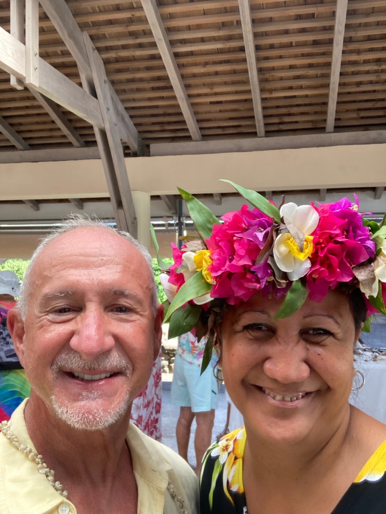After lunch, I sauntered over to the Dive Shop and begged them to call a taxi for me, which they were happy to do so I needn’t have begged. It arrived about 15 minutes later and in another ten, I arrived back at the pier in Opunohu Bay. I tried to find my friend Paloma who had given me a ride the night before, but she was in Pape’ete for the day. This is her friend Marlene wearinga beautiful headdress or crown seen on many of the French Polynesian women.