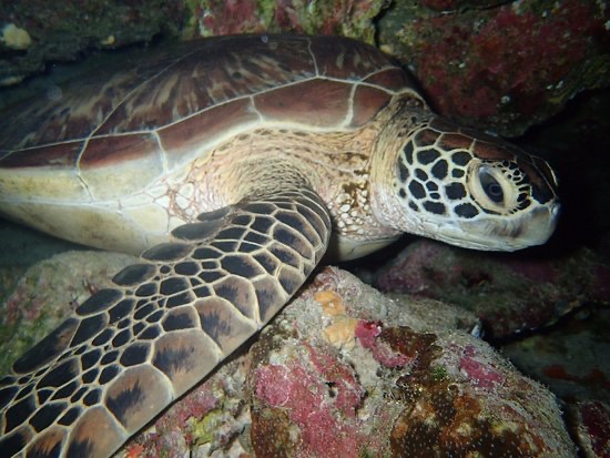 The visibility at the site was great, and very quickly after arriving at our 45-foot depth, we encountered a large green turtle napping on the ocean floor. Turtles are always comical in this state because they inevitably open their eyes at some point…. and then close them without budging any other part of their body, as if to say: “Oh, not you again.”