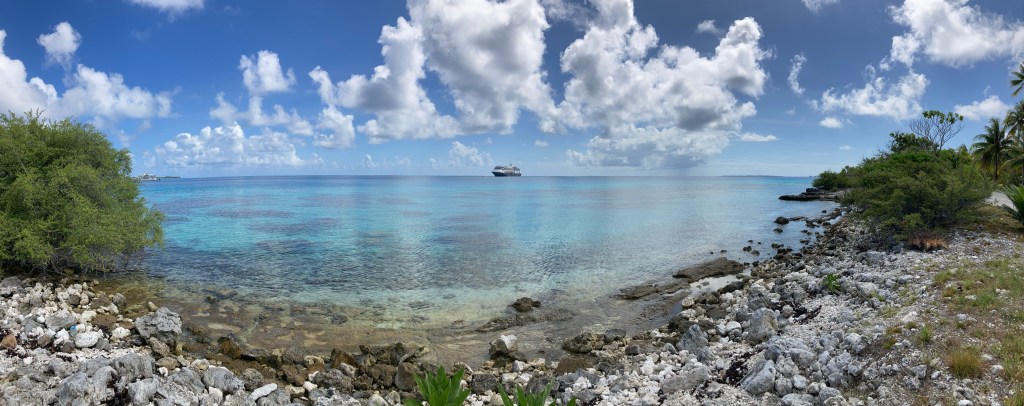 I ended up renting a bike for exploring via the road – the ONE road – that runs along the spine of the upside down “L.” You can literally get off your bike and have a very nice snorkel at any point along the road — on the lagoon side, not the ocean!