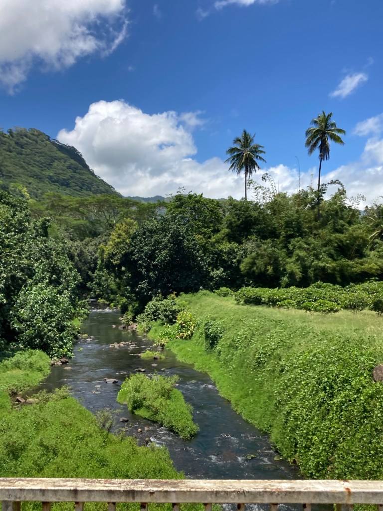 I scored a ticket to the day’s only shore excursion: a caravan of privately owned trucks tricked out with bench seats in their beds like the ones in Moorea. Breathtaking scenery at every turn – and there were lots of turns as we switch backed up and over the high mountains, then descended deep into fertile valleys thriving with exceptionally large citrus, banana, and mango trees and exceptionally numerous coconut trees – in some cases cultivated 2/3 the way up the interior slopes the mountain.